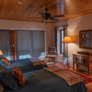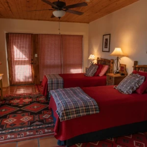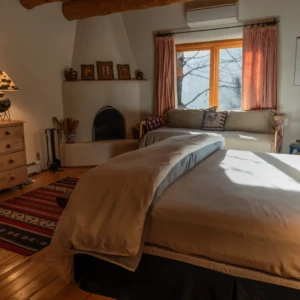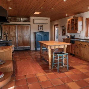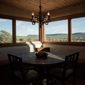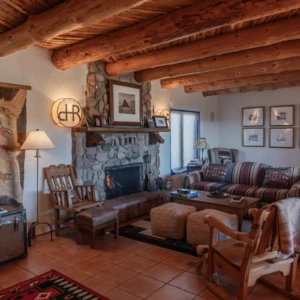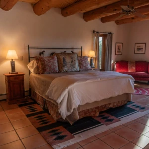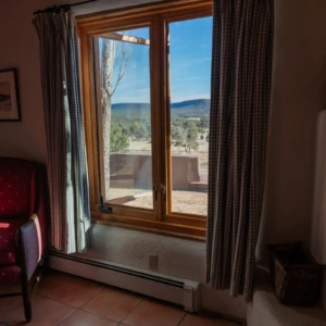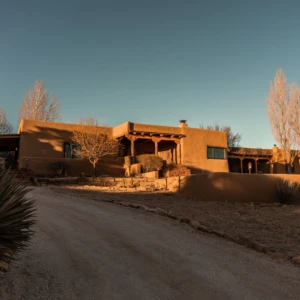 Beyond the interiors, the Hill House offers extensive outdoor living areas including 3,740 square feet of portals and patios, a 704-square-foot detached carport, and a 900-square-foot Mesa Vista viewing area, ideal for entertaining or simply taking in the sweeping New Mexico views. Interior finishes include wood and tile floors, plaster walls, double-pane operable windows, and radiant floor heating throughout.